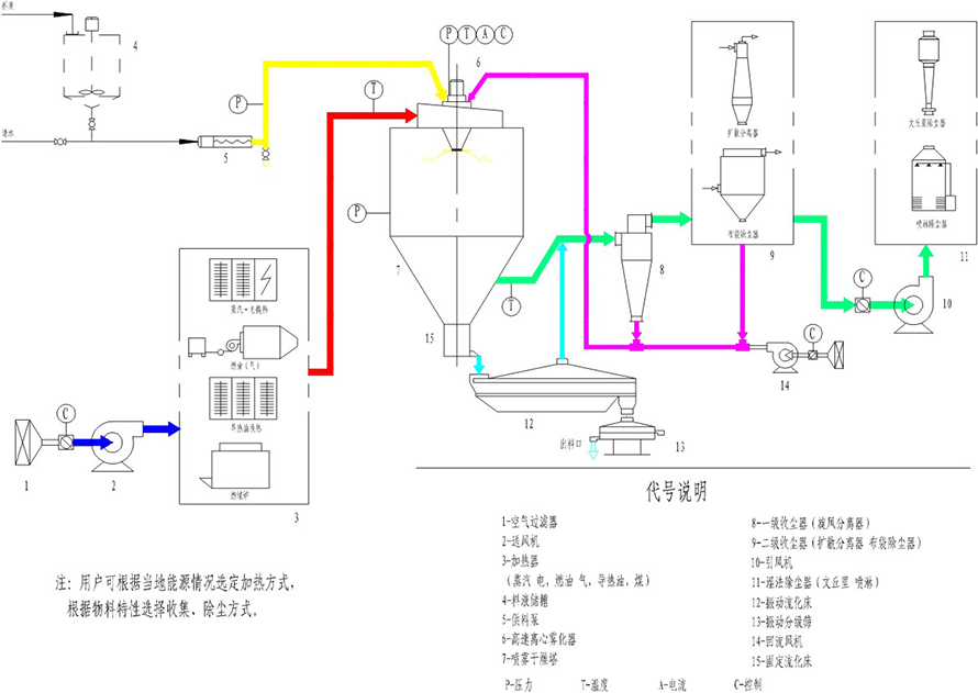 空氣通過(guò)過(guò)濾器和加熱裝置后,進(jìn)入干燥塔頂部的熱風(fēng)分配裝置,通過(guò)此裝置使?jié)崈舻?、熱的空氣均勻的進(jìn)入干燥塔,并呈螺旋狀轉(zhuǎn)動(dòng),同時(shí)將料液送到安置在干燥塔頂中間的離心霧化器中,料液被離心霧化器霧化成霧滴,使料液和熱空氣的接觸面積增加,水分迅速蒸發(fā),在短時(shí)間內(nèi)干燥。再通過(guò)之后的除塵設(shè)備等,將干燥好的成品取出。成品連續(xù)的由收料口輸出,廢氣由引風(fēng)機(jī)排空。